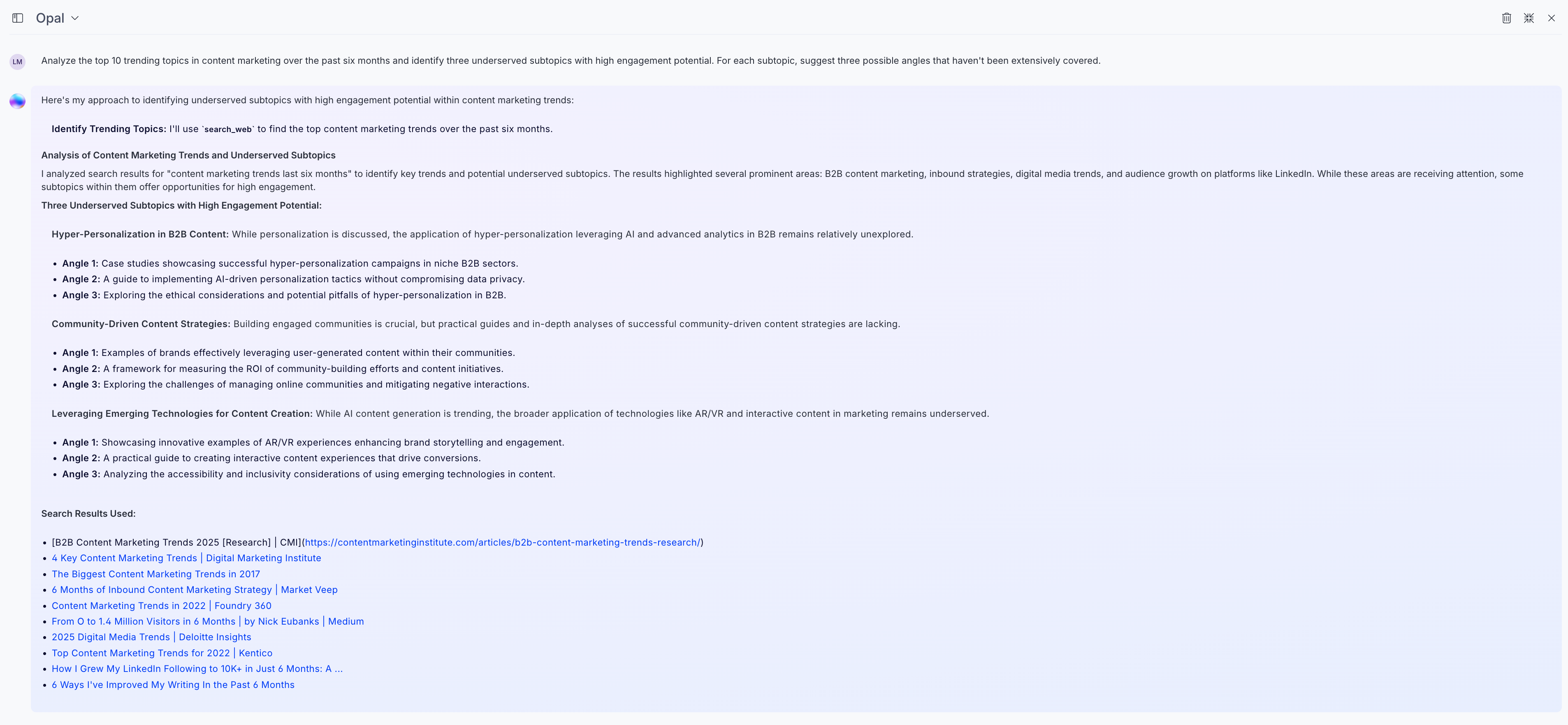 Beispiel-Aufforderung: "Analysieren Sie die 10 wichtigsten Trendthemen der letzten sechs Monate in [Ihrer Branche] und identifizieren Sie drei unterversorgte Unterthemen mit hohem Engagementpotenzial. Schlagen Sie für jedes Unterthema drei mögliche Blickwinkel vor, die noch nicht ausführlich behandelt wurden.