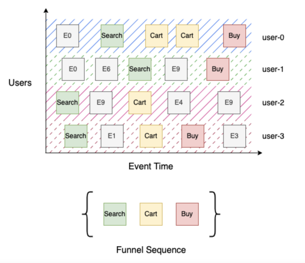 Betrachten wir einen einfachen 3-stufigen Trichter mit den Stufen Suchen, Einkaufswagen und Kaufen. Suche (Stufe 1) identifiziert alle Benutzer, die nach dem Produkt gesucht haben, Warenkorb (Stufe 2) identifiziert alle Benutzer, die nach einem Produkt gesucht und es in den Warenkorb gelegt haben, und schließlich Kauf (Stufe 3) identifiziert alle Benutzer, die nach einem Produkt gesucht, es in den Warenkorb gelegt und zur Kasse gegangen sind. Der Aufbau dieses Trichters ist einfach, wenn Sie einen nach Ereigniszeit sortierten Strom von Benutzerereignissen haben. Gehen Sie für jeden Benutzer die Abfolge der Ereignisse durch, um seinen Fortschritt durch den Trichter zu verfolgen, und aggregieren Sie dann die einzelnen Benutzer nach Stufe. Im obigen Beispiel haben "user-0" und "user-3" den Schritt zum Kauf (Stufe 3) gemacht, "user-1" hat die Suche (Stufe 1) erreicht, da es kein Warenkorb-Ereignis in seinem Ereignisstrom gibt, und "user-2" hat den Warenkorb (Stufe 2) erreicht.