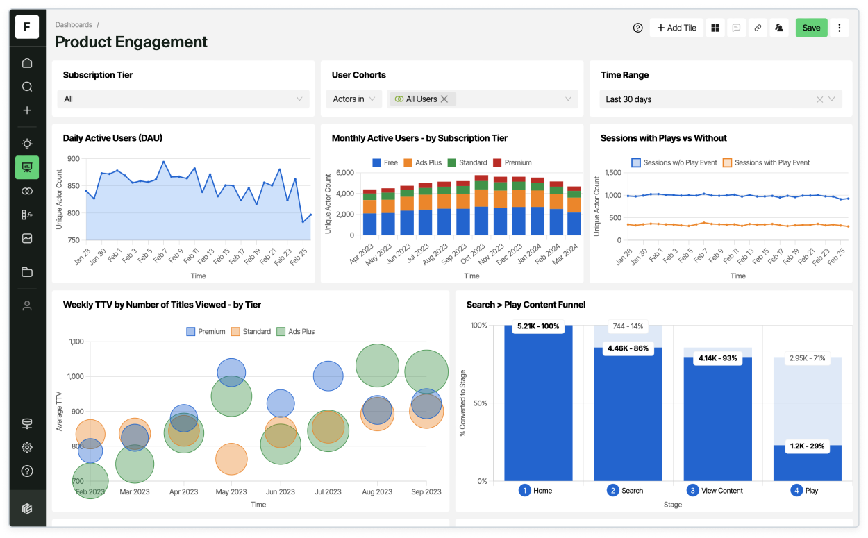 BI-Tools sind für die dimensionale Analyse von Metriken mit Modellierungsartefakten wie Stern- und Schneeflockenschemata konzipiert. Sie werden in erster Linie für die Berichterstattung über Zustandsdaten (Geschäftsvorgänge aus POS, Auftragserfassung, Lieferkette, Vertrieb, Finanzen, HR usw.) im Lager verwendet. In Unternehmen mit einer großen Anzahl kundenorientierter digitaler Produkte besteht auch die Notwendigkeit, mit Ereignisströmen zu arbeiten, z.B. mit Daten von Produkt-/Website-/Mobilgeräten, IoT-Geräten, Wearables, Marketing-Touchpoints, Anrufen, Chats usw. In der Vergangenheit wurden diese Art von Daten nie in Data Warehouses gespeichert, und die Analyse dieser Daten erfolgte in speziellen SaaS-Tools wie Marketing/Web Analytics, Product Analytics, Digital Experience Analytics usw. Diese Daten und die zur Analyse dieser Daten verwendeten Tools waren unabhängig von den Data Warehouses und BI-Tools des Unternehmens. Infolgedessen sind die Analysen fragmentiert, nicht sehr umfangreich und unzuverlässig. Immer mehr Ereignisdaten fließen in moderne Cloud Data Warehouses wie Snowflake und BigQuery ein. Optimizely Warehouse-Native Analytics ist das erste Tool, das auf Data Warehouses aufbaut und nahtlos Ereignis- und Zustandsdaten verarbeiten kann - ein einziges Self-Service-Tool mit Funktionen zur Analyse von BI- und Ereignisdaten. Die schablonengesteuerte Benutzeroberfläche von Optimizely Warehouse-Native Analytics bietet die Möglichkeit, Metriken in klassische Dimensionen aufzuschlüsseln, aber auch Ereignisfolgen, Verhaltenskohorten, User Journeys usw. einzubeziehen. So können Sie z.B. die Abonnementeinnahmen ganz einfach nach verschiedenen Nutzerkohorten aufschlüsseln, z.B. nach Marketing Targeting, neuen Nutzern, sehr engagierten Nutzern usw.